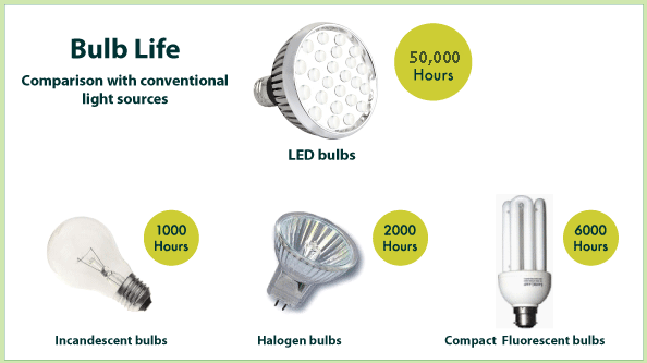 Long life time stands out as the number one benefit of LED lights. LED bulbs and diodes have an outstanding operational life time expectation of sometimes up to 100.000 hours.